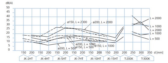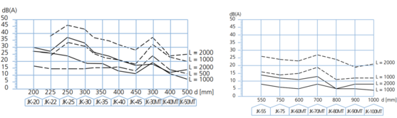 In den Diagrammen sind die Schalldruckwerte in dB (A) für Ventilatoren und Gebläse unter den in der Broschüre aufgezeigten Betriebsbedingungen dargestellt. Autorisierte Schallleistungsmessungen für JKF-Rohrschalldämpfer wurden durchgeführt.